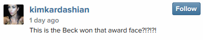 John Legend may like and respect Mrs West, but he doesn't want to be used in any of her games...and he indirectly called her out on Twitter. So here's what happened. You all remember on Grammy night, Kanye West was pissed that Beck won Album of the year award rather than his choice, Beyonce. Well, Kim later posted a selfie with John Legend and his wife (above) from the audience claiming they were all in shock when Beck won the award. Kim wrote "This is the Beck won that award face!"