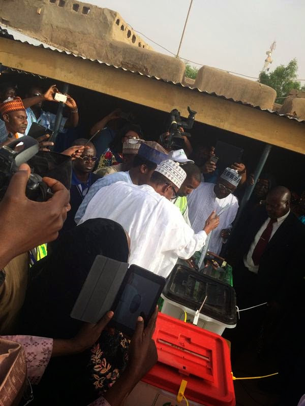 Photos: Gen. Buhari casts his vote + relaxes with his wife... The APC presidential candidate voted at a polling unit near his hometown. More photos after the cut.. He relaxed with his wife before going to cast his vote... Email ThisBlogThis!Share to XShare to Facebook